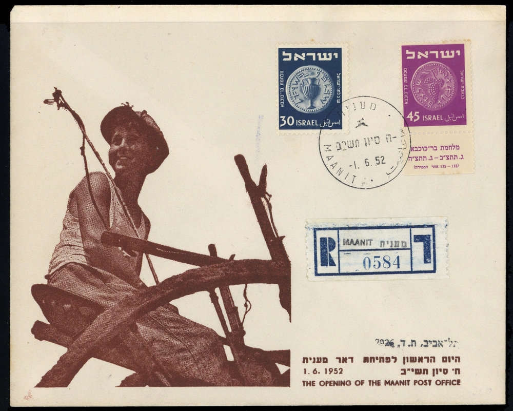 "MAANIT 1.6.52", K1 auf Eröffnungs-Schmuck-R-Brief mit 30 und 45 (Zf) Pr. Münzen, Alters- rs. Falzspuren, Ak-K1 "TEL AVIV-YAFO 2.6.52"