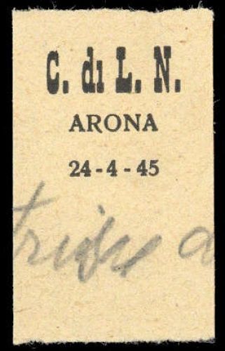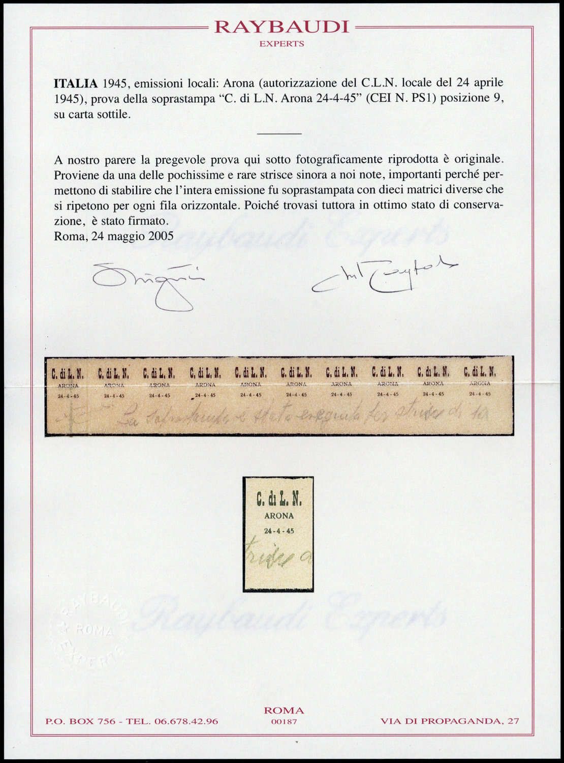 ARONA: 1945, Probedruck nur des Aufdruck auf dünnem ungummiertem Papier hergestellt, signiert und Farbfotoattest Raybaudi/Rom (CEI- Katalognummer 17)