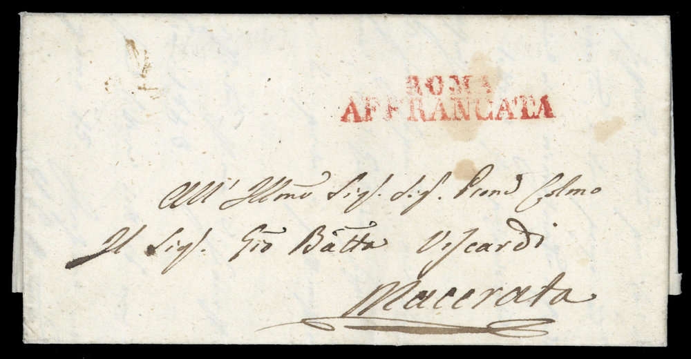 "ROMA AFFRANCATA", roter L2 auf Brief nach Macerata aus dem Jahr 1843, leichte Alterungsspuren