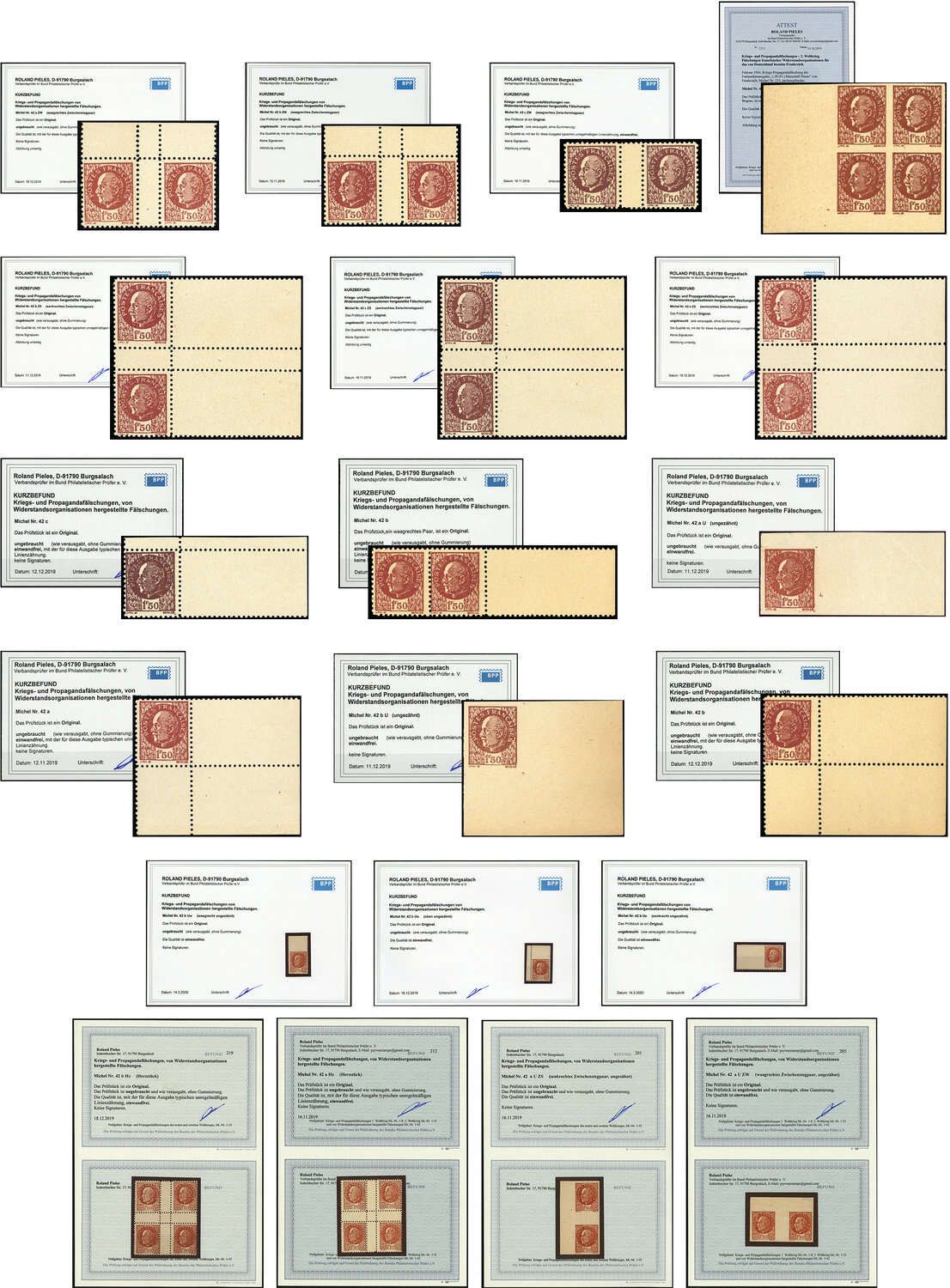 KRIEGS- UND PROPAGANDAFÄLSCHUNGEN II. WK: Außergewöhnliche Kollektion der 1.50 Fr. Propagandafälschung Marschall Petain (MiNr.42) in verschiedenen Farben auf ungummiertem Papier. Hierbei auch senkrechte und waagerechte Zwischenstege gezähnt und ungezähnt sowie verschiedene Herzstücke. Für jedes Stück liegt ein aktuelles Farbfotoattest bzw. ein Befund von Herrn Pieles BPP "echt und einwandfrei" bei. In dieser Reichhaltigkeit selten anzutreffen. Einige Stücke sind sogar nicht einmal im Michel Spezial 2023 notiert!