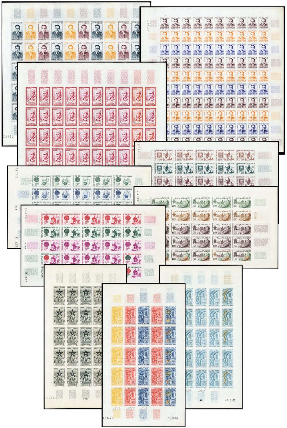 MAROKKO: 21 Original- Druckbögen ungezähnt postfrisch mit insgesamt 650 einzelnen Farbproben von diesem interessanten Gebiet im Stichtiefdruck sogar bereits ab den 50-er Jahren. Die seltenen Druckbögen weisen auch Druckdaten auf und zudem teilweise Randbedruckungen und handschriftliche Vermerke des Druckers. Dabei auch gute thematische Ausgaben vorhanden, wie z.B. Fische u.a.. Optisch eine tolle Bereicherung jeder Marokko- Sammlung!