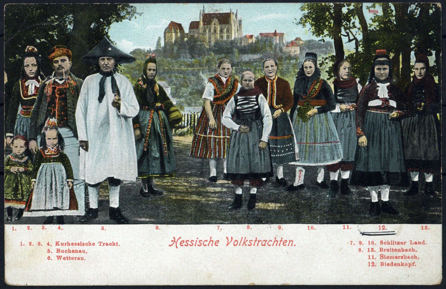 Hessen, farbige AK (Hessische Volkstrachten aus 7 Regionen), mit DR 5 Pf grün, DB "WILHELMSHÜTTE 13.5.02", Beförderungs- Altersspuren, nach Solingen
