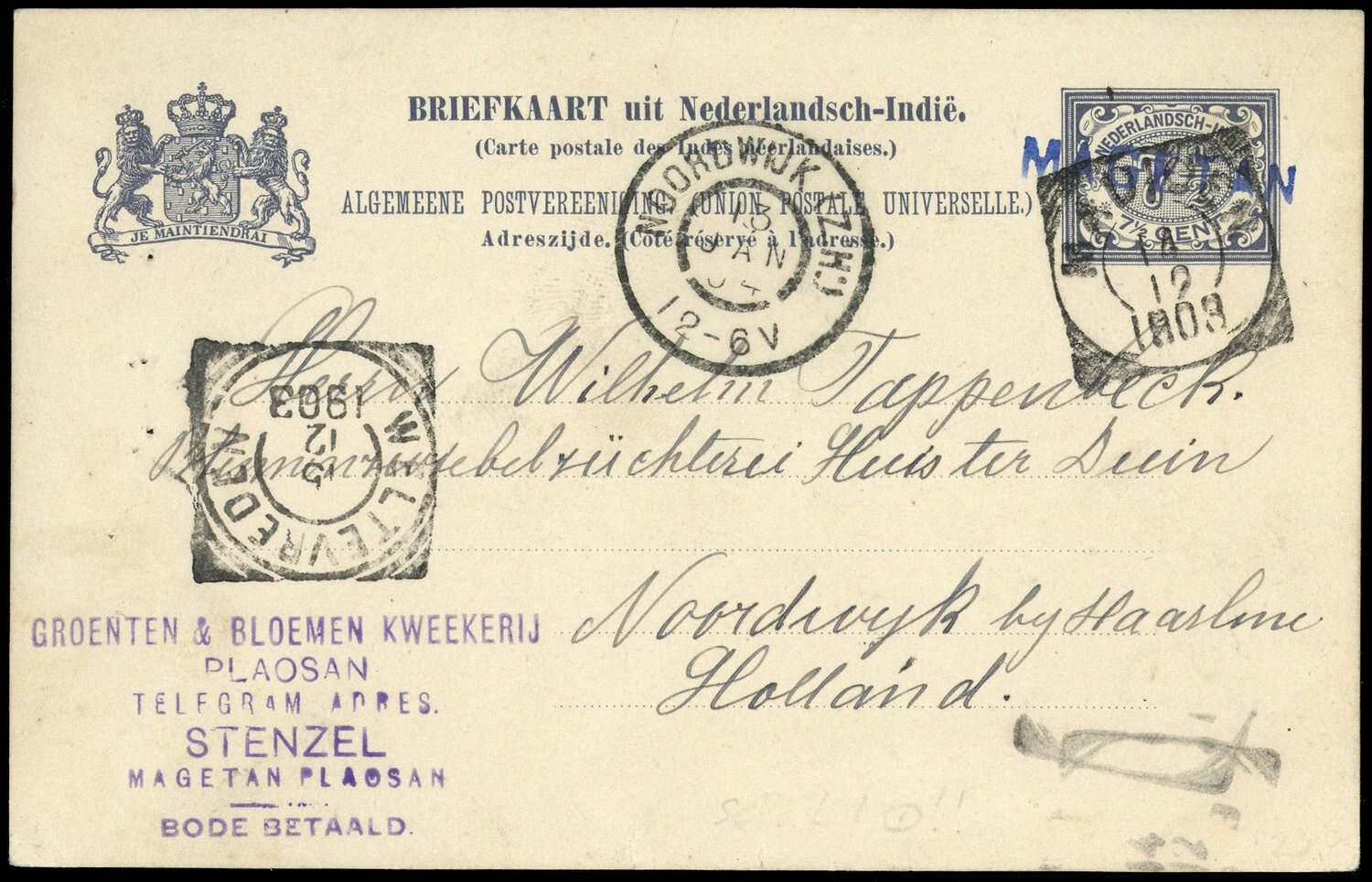 "MAGETAN" klarer blauer L1 auf 7 1/2 C grau, GSK Querrechteck, links Nadellochungen, mit Quadratstempel "MAGETAN 14 12 1903", via Weltevreden (15 12 1903), Beförderungs- Altersspuren, Ak -K2 "NOORDWIJK 13 JAN 04"