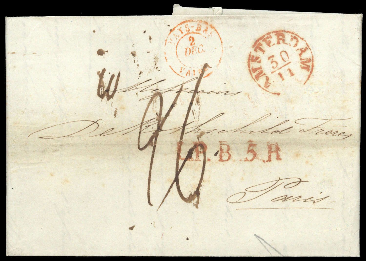 "AMSTERDAM 30/11", roter K1, sowie L1 "L.P.B.5.R", K2 "PAYS-BAS 2 DEC (42)", auf Brief mit Inhalt, Taxe, mittig waagerechte Faltung, stärkere Beförderungs- Altersspuren, nach Paris