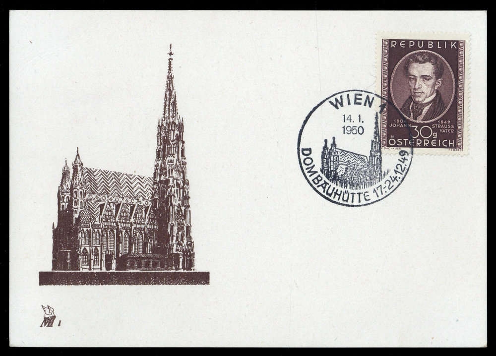 "WIEN 14.1.50 DOMBAUHÜTTE 17.-24.12.1949", SST auf Sonderkarte mit 30 Gr. Strauss