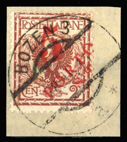 BOZEN 3: Porto S.T. 5 auf 2 C. Freimarke auf Bedarfs-Briefstückchen, geprüft Sturzeis VÖB (Sassone 150.- Euro)