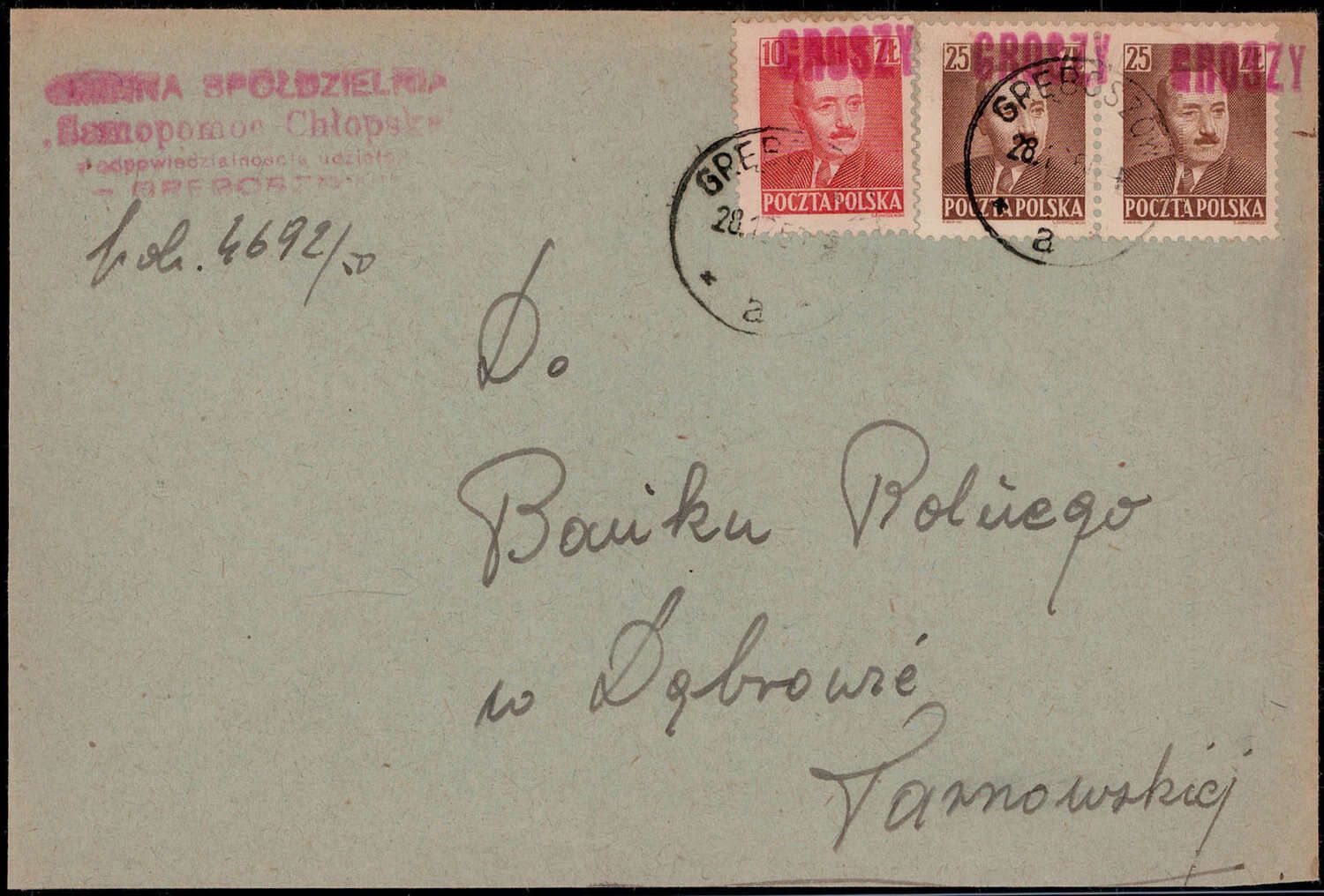"GREBOSZOW", roter Groszy-Überdruck in Type 3 auf unten geöffnetem Bedarfsbrief 28.12.50, ex Sammlung Günter Rost