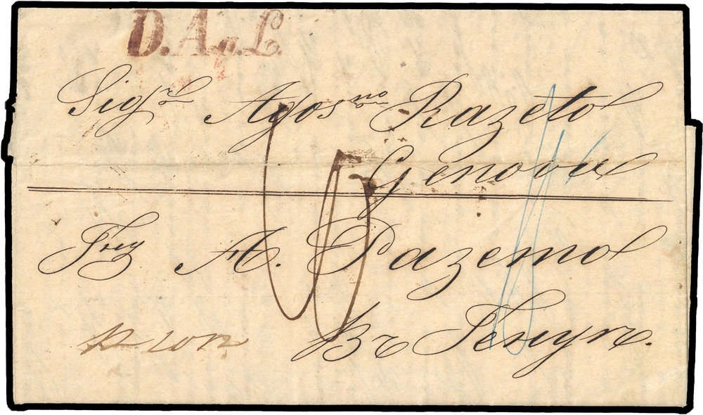 "MARIANOPEL 18 ... 1856", L2 rs. auf Brief nach Genua mit rotem "D.Aa.L."
