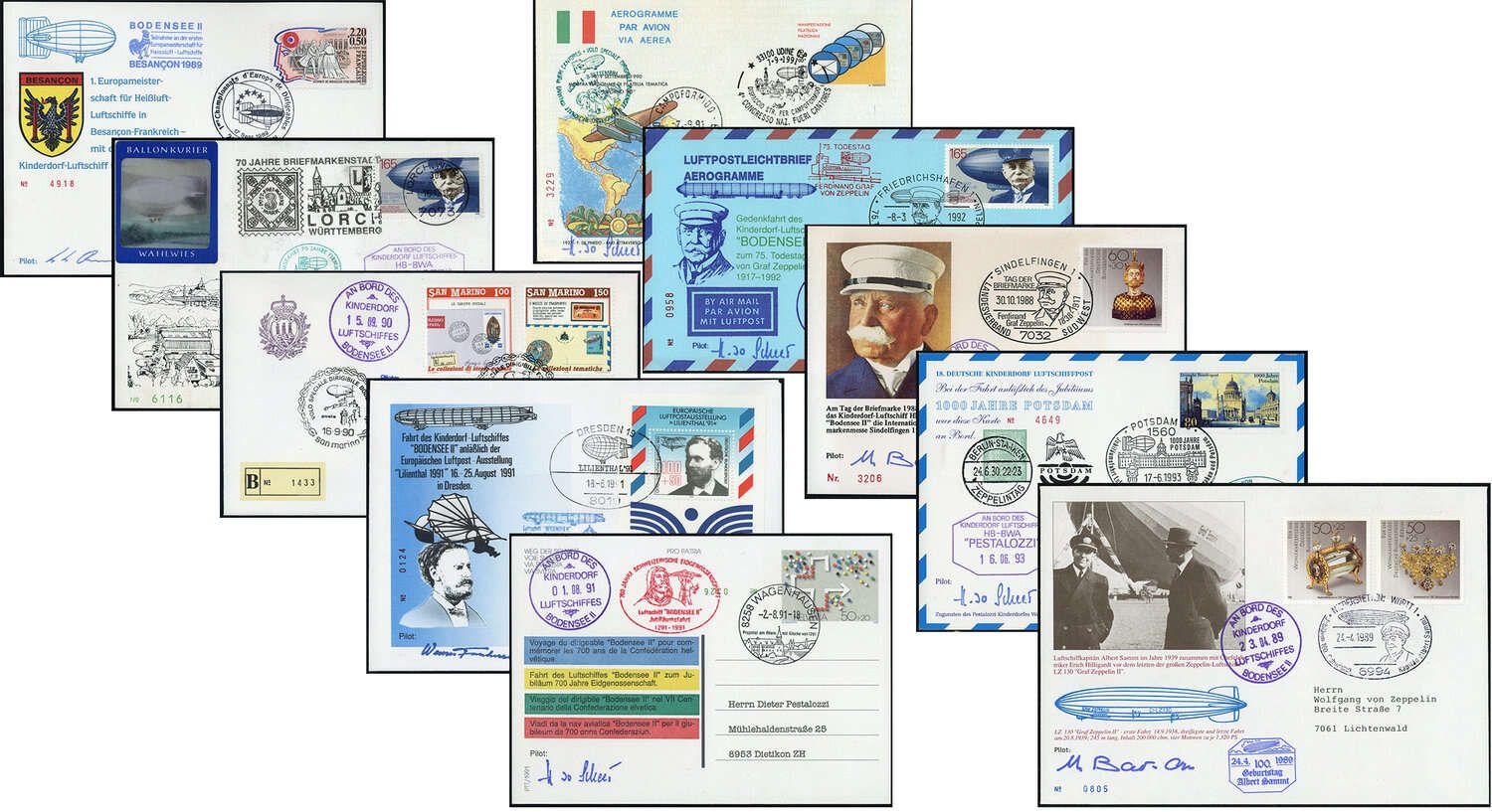 ZEPPELIN KINDERDORF BELEGE: Zwei große Umzugskisten mit weit über 15.000 echt geflogenen Zeppelinbelegen aus den 80-er und 90-er Jahren zu Gunsten des Pestalozzi Kinderdorfes. Alle mit originalen Bordpoststempeln, aus vielen verschiedenen europäischen Ländern, hochwertig frankiert und oft in guter Anzahl von ein paar hundert Stück pro Sorte. Es handelt sich dabei um den kompletten Restbestand dieses Sammelgebietes eines Versandhändlers. Ideal für Kollektionen oder zum Detailverkauf.