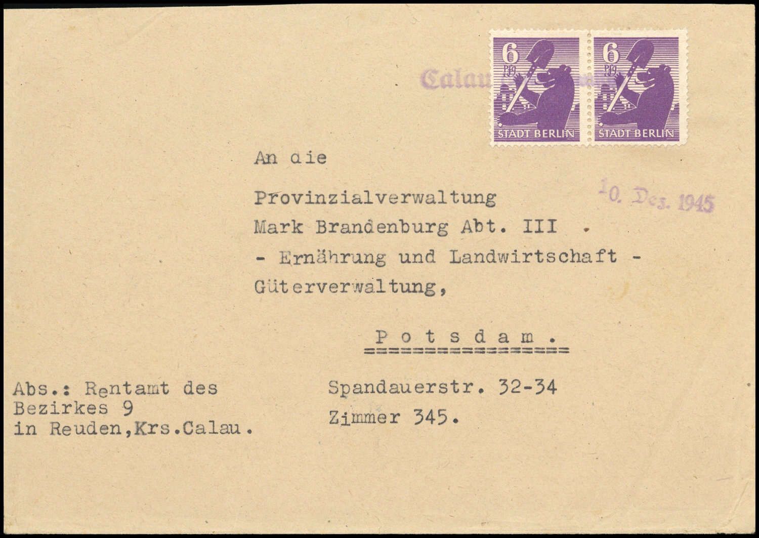 "Calau 10. Dez. 1945" als violetter NOT-Stempel auf Brief mit Paar Nr. 2 A (Zahnverkürzungen) frankiert nach Potsdam, leichte Spuren.