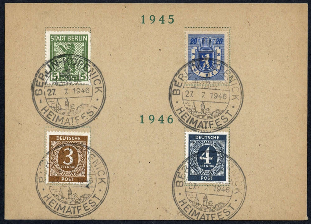 "BERLIN-KÖPENICK 27.7.46 HEIMATFEST", 4 x SST bs. auf Sonderkarte mit 5 und 20 Pfg. Bär und 3 und 4 Pfg. Ziffer