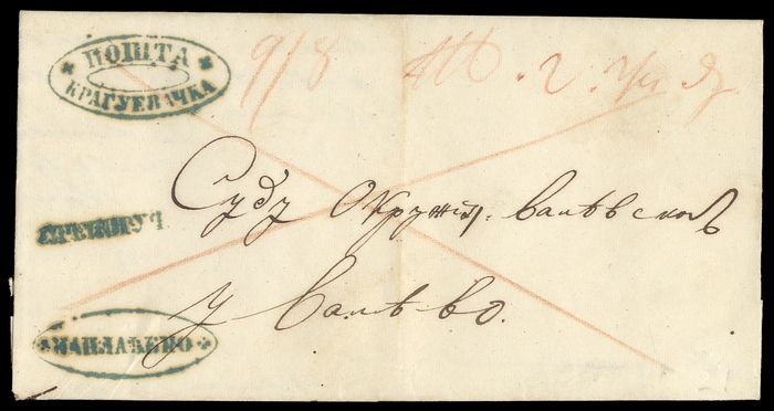 "KRAGUJEVAC", ovaler K2 in blaugrün und ng. L1-und ovaler K1-Frankostempel auf Brief aus 1860 mit Inhalt, übliche Faltung, Beförderungs-und Alterungsspuren