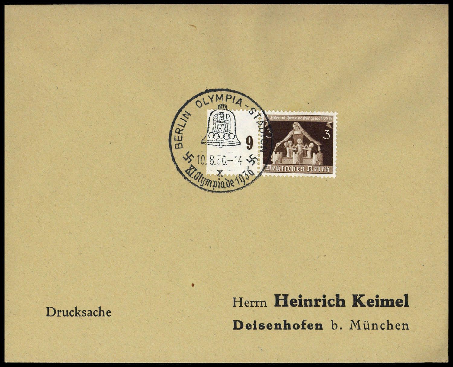 "BERLIN OLYMPIASTADION 10.8.36 x OLYMPIADE", SST auf phil. Brief mit 3 Pfg. Gemeindekongress