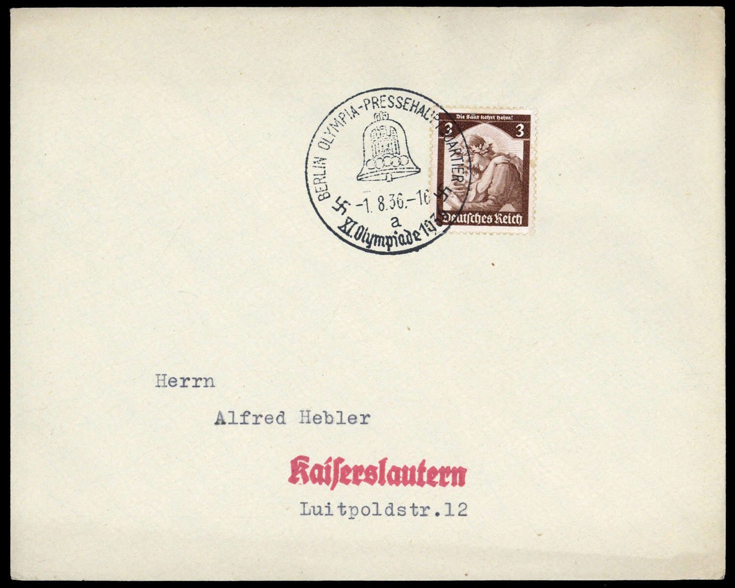 "BERLIN PRESSEHAUPTQUARTIER 1.8.36 a OLYMPIADE", SST auf phil. Brief mit 3 Pfg. Saarheimkehr