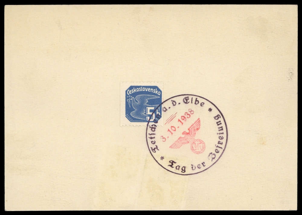 "TETSCHEN a.d. Elbe 3.10.1938 - TAG DER BEFREIUNG" auf Blankokarte mit 5 H. CSSR-Zeitungsmarke (Nr. 365 mit Privatzähnung), saubere Erhaltung.