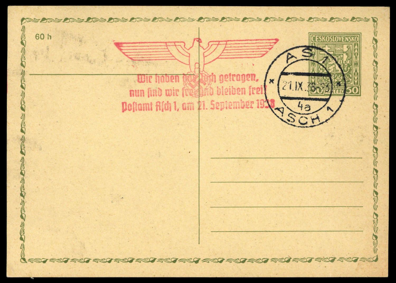 "AS 1 - 21.IX.1938 ASCH 1" auf 50 H. CSSR-Ganzsache, nebengesetzt roter Befreiungsstpl. "Wir haben das Joch getragen, Postamt Asch 1 am 21.9.1938", leichte Spuren.