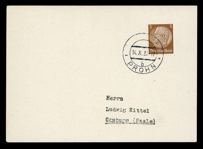 "PROHN 14.X.38", aptierter K2 auf phil. Karte mit 3 Pfg. Hindenburg