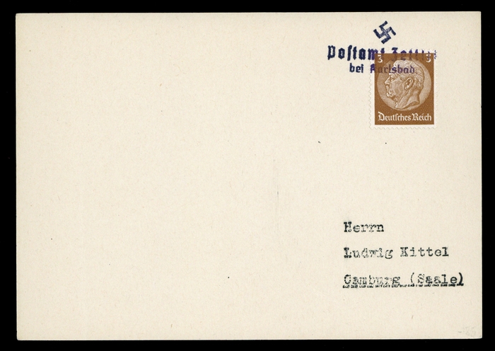 "POSTAMT ZETTLITZ BEI KARLSBAD" violetter L2 auf phil. Karte mit 3 Pfg. Hindenburg