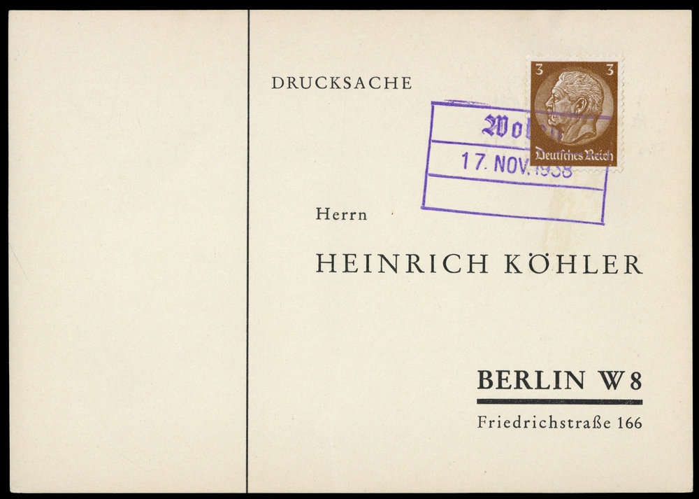 "WOKEN 21. NOV.1938", violetter Ra3 auf phil. Karte mit 3 Pfg. Hindenburg