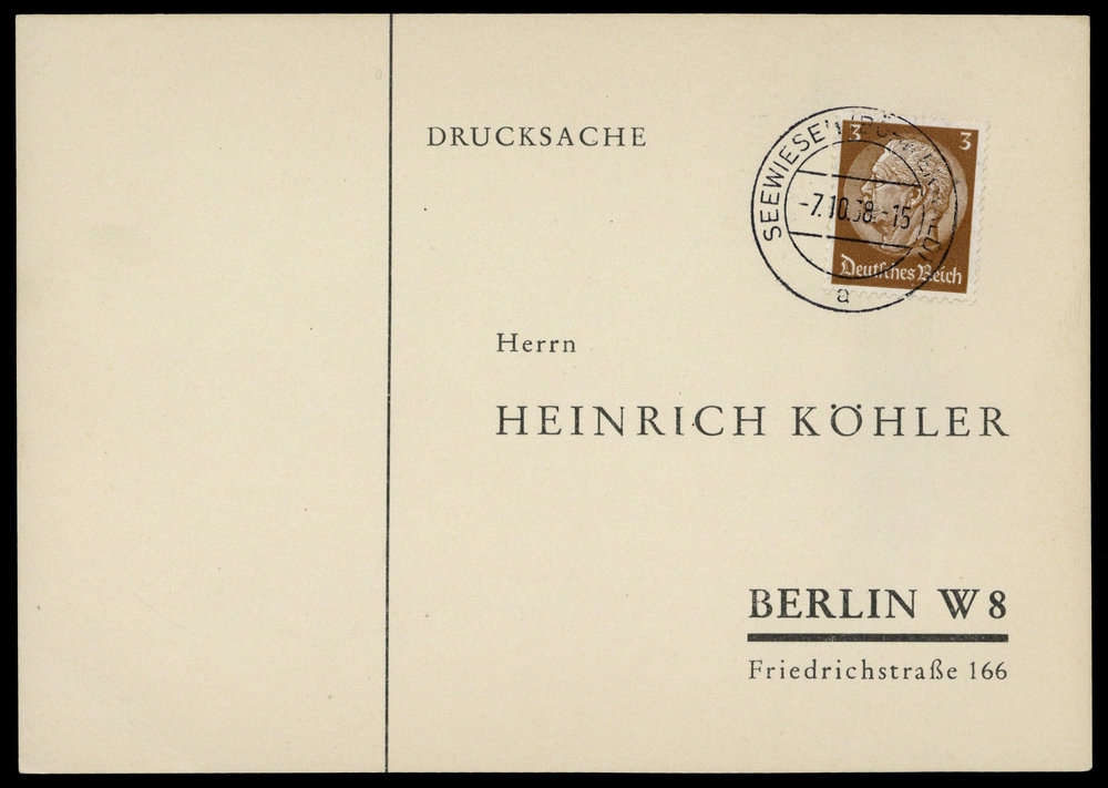 "SEEWIESEN (BÖHMERWALD) 7.10.38 a", K2 auf phil. Karte mit 3 Pfg. Hindenburg