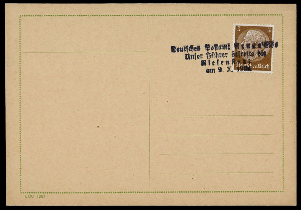 "DEUTSCHES POSTAMT ARNAU/ELBE UNSER FÜHRER BEFREITE ...", L4 auf Blankokarte mit 3 Pfg. Hindenburg, Marke Zahnmängel