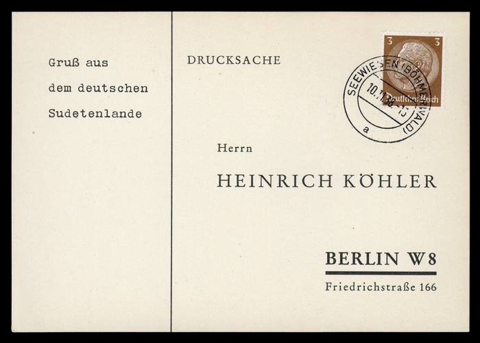 "SEEWIESEN (BÖHMERWALD) 10.11.38" auf phil. Karte mit 3 Pfg. Hindenburg