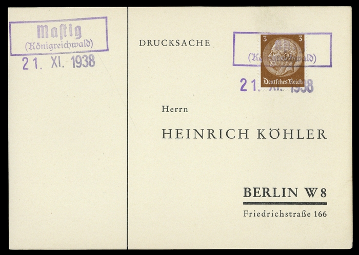 "MASTIG (KÖNIGREICHWALD)", Ra2 und "21.XI.1938", auf phil. Karte mit 3 Pfg. Hindenburg