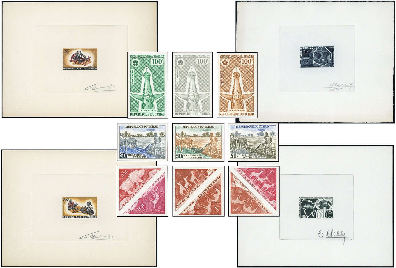 TSCHAD: Spezialitätensammlung mit 15 verschiedenen Epreuve d`Artiste alle mit Original- Unterschrift des Künstlers und offiziellem Kontroll- Prägesiegel im Rand. Zusätzlich noch 19 Ausgaben mit insgesamt 75 verschiedenen ungezähnten Farbproben postfrisch. Die seltenen Ausgaben ab den guten 60-er Jahren sind überwiegend im Stichtiefdruck hergestellt und beinhalten auch noch tolle thematische Themen wie Fernmeldewesen, Kunsthandwerk usw.. Ausgefallene Sammlungsergänzungen sind im Trend!