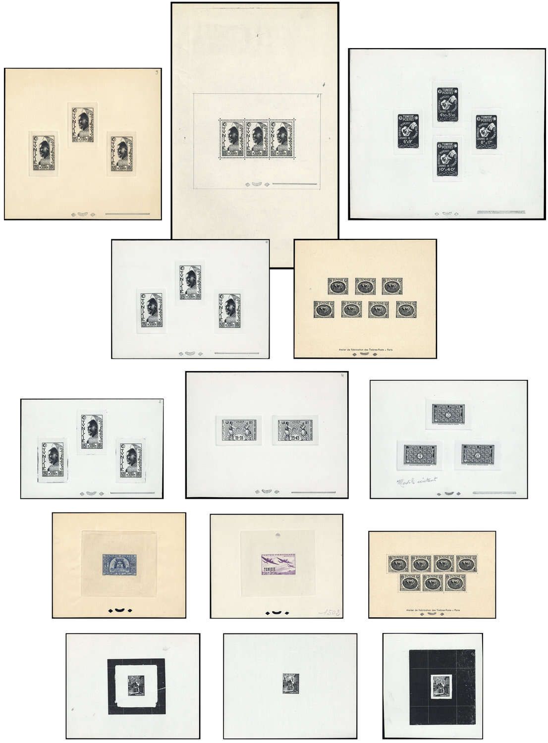TUNESIEN: Erlesene Kollektion von 31 Künstlerdrucken bzw. Probedrucken im Blockformat ab den guten 50-er Jahren. Oft mit ausführlichen handschriftlichen Vermerken der Drucker. Von diesen frühen Ausgaben existieren nur ein paar Stücke und sind zum Teil auch Unikate. Für spezialisierte Tunesien- Sammler, die in Ihre Sammlung etwas wirklich Ausgefallenes integrieren möchten!