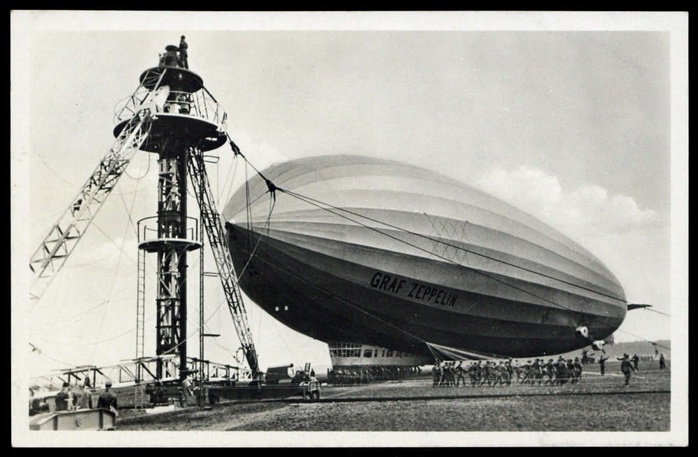 "LZ 127 wird an den Ankermast gebraucht", s/w-Karte, gelaufen mit Luftschiffhafen-Nebenstempel, Marke Aufklebespuren, DZR