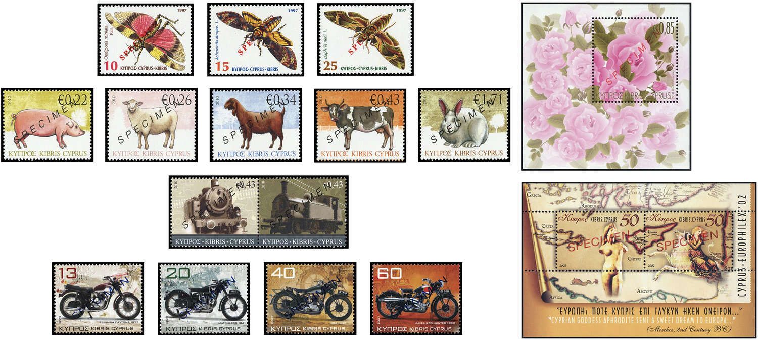 ZYPERN MUSTERMARKEN: Über 850 verschiedene postfrische Ausgaben als Mustermarken mit dem Aufdruck "SPECIMEN" auch mit Euro- Briefmarken. Dabei auch komplette Sätze und Dauerserien sowie 2 Markenheftchen. Eine interessante Bereicherung jeder Zypern- Sammlung mit diesen nicht alltäglichen Ausgaben, welche offiziell nur an wenige Personen, u.a. zu Pressemitteilungen zugesandt wurden.